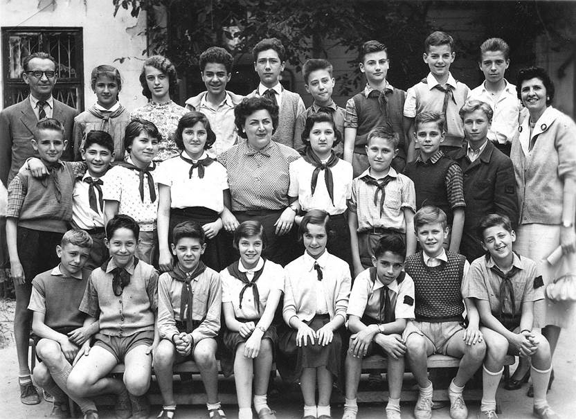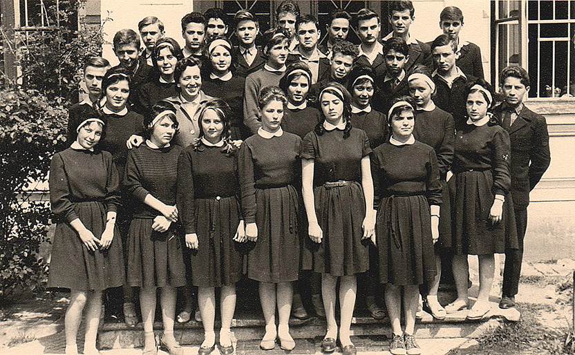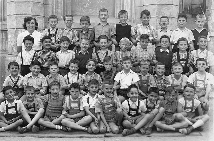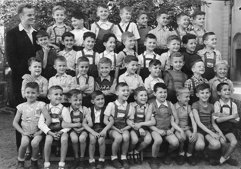 7. A-Klasse mit den Lehrern Hans Jekel (Mathe), Gertrude Zimring